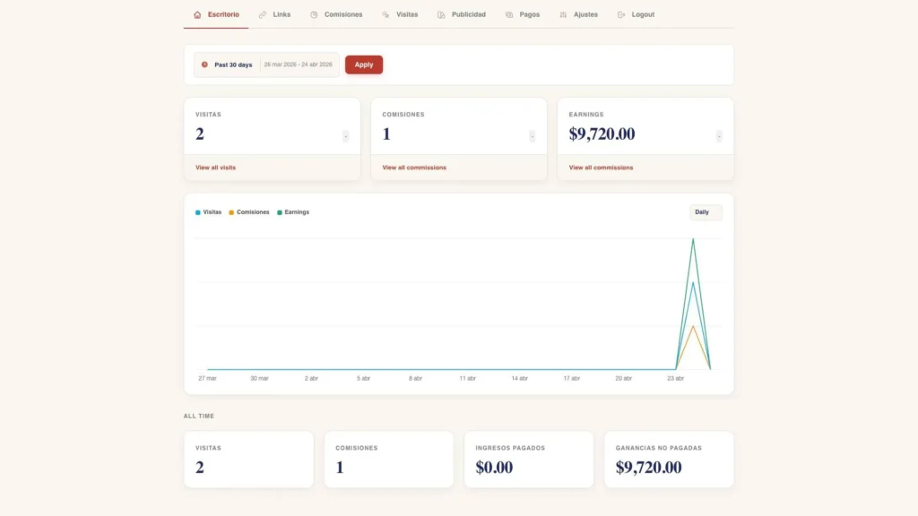 - Acceso al panel de control personal. El afiliado puede ver en tiempo real cuántos clics ha generado su enlace, cuántas ventas se han completado y cuánto ha acumulado en comisiones. Información disponible las 24 horas.